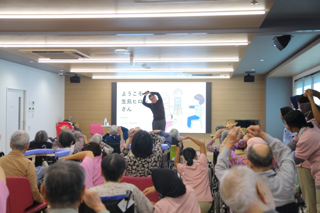生島様が普段から実践されているという「健康体操」を、利用者様全員で楽しく体験させていただきました。生島様の明るくパワフルなリードで、会場は終始笑顔と活気に満ち溢れ、体を動かす喜びを改めて感じることができました。